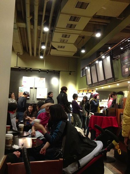 天氣很冷,人兒們聚集在星巴克喝咖啡聊天看影片,