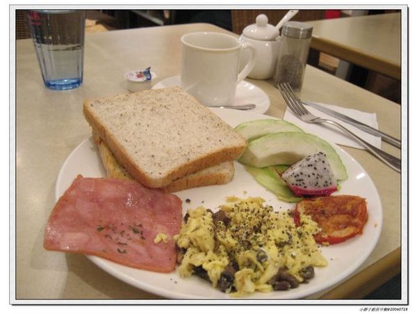 心裡頭這麼想著,實際上吃的有點狼吞虎嚥。提早出門,保留二十分鐘享用早餐應該足夠。但是扣除點餐及拍照時間,只剩下十分鐘要將一盤食物吃完,對一向慢慢來的愛拉拉來說,太困難了。吃了青脆的芭樂、蘑菇炒蛋和焗蕃茄起士,其它只好請服務生打包外帶。