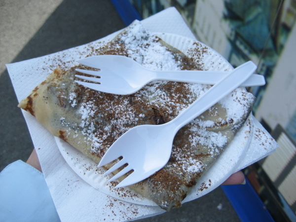 其中,一家賣法式薄餅(French Crepes)的攤子最是吸引人了。近幾年來,台灣吹起一股法國風,法式可麗餅、小圓餅Maracon等法式甜點在台北造成一股風潮。談到吃,台灣人特別捨得花錢,一個小圓餅價值等同於一個便當錢,在不景氣的年代,還是有很多人願意花錢嘗試,可見它的魅力呀...